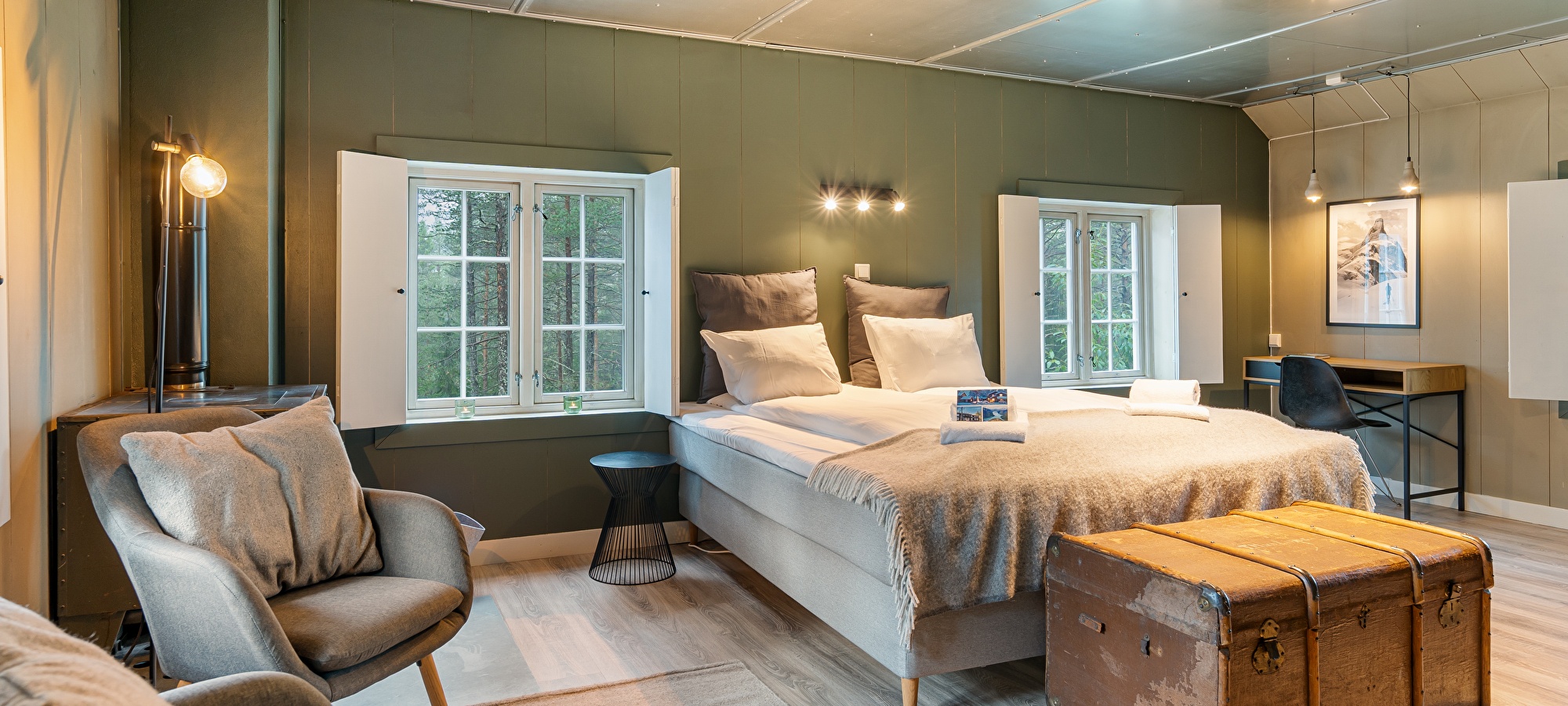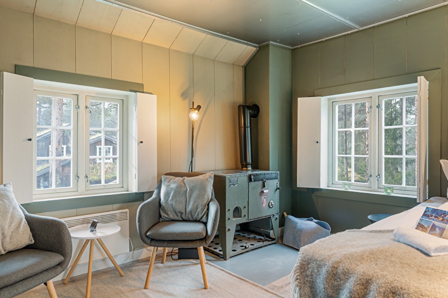 The Rasletind Suite offers a cozy alpine retreat with rugged charm, perfect for relaxation after a day outdoors. Featuring natural materials, this suite embodies warmth and comfort. Named after Rasletind (2105m), a popular peak in Jotunheimen National Park, it is known for its stunning views and easy access, making it a favorite for hikers and skiers alike.